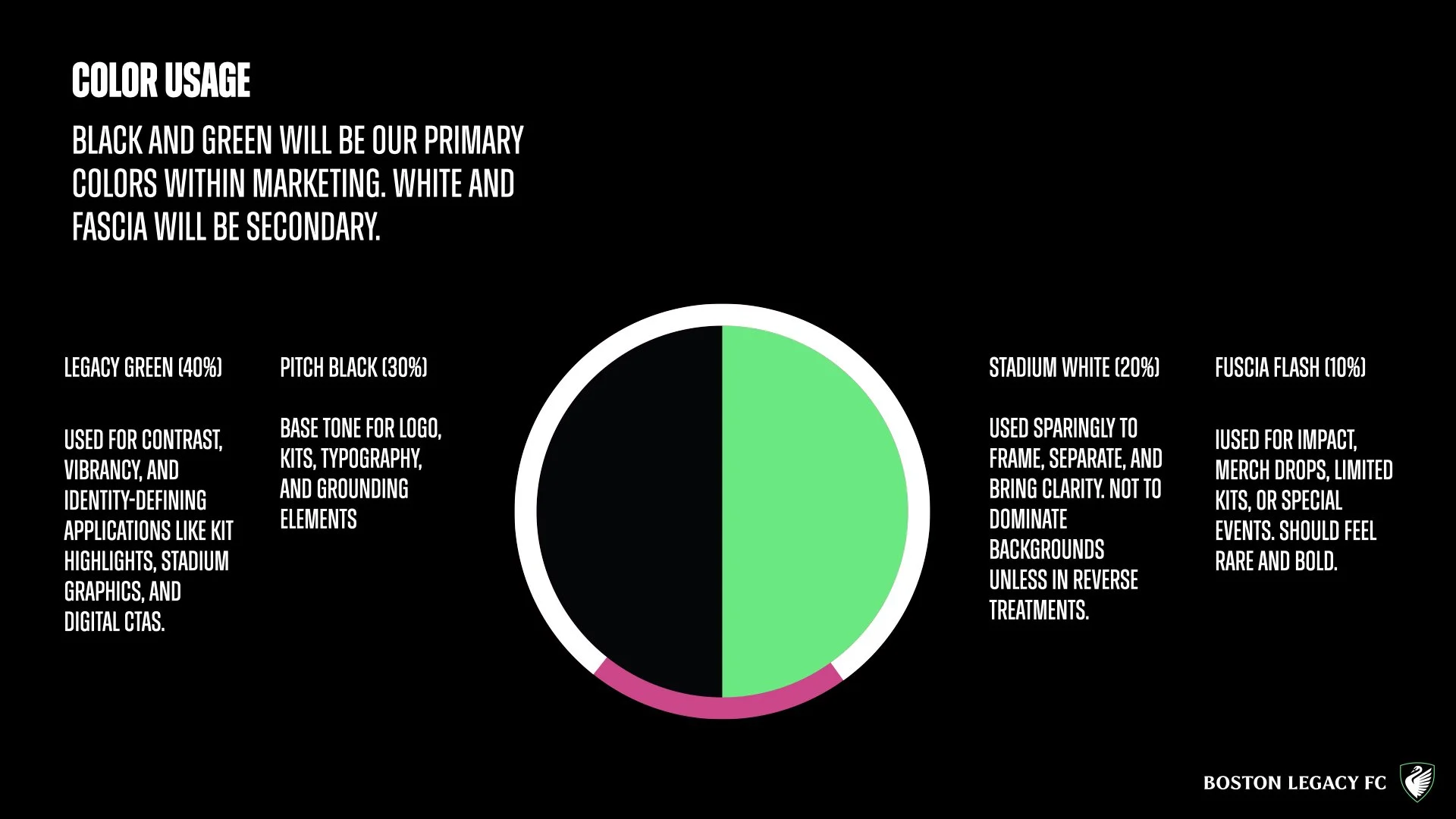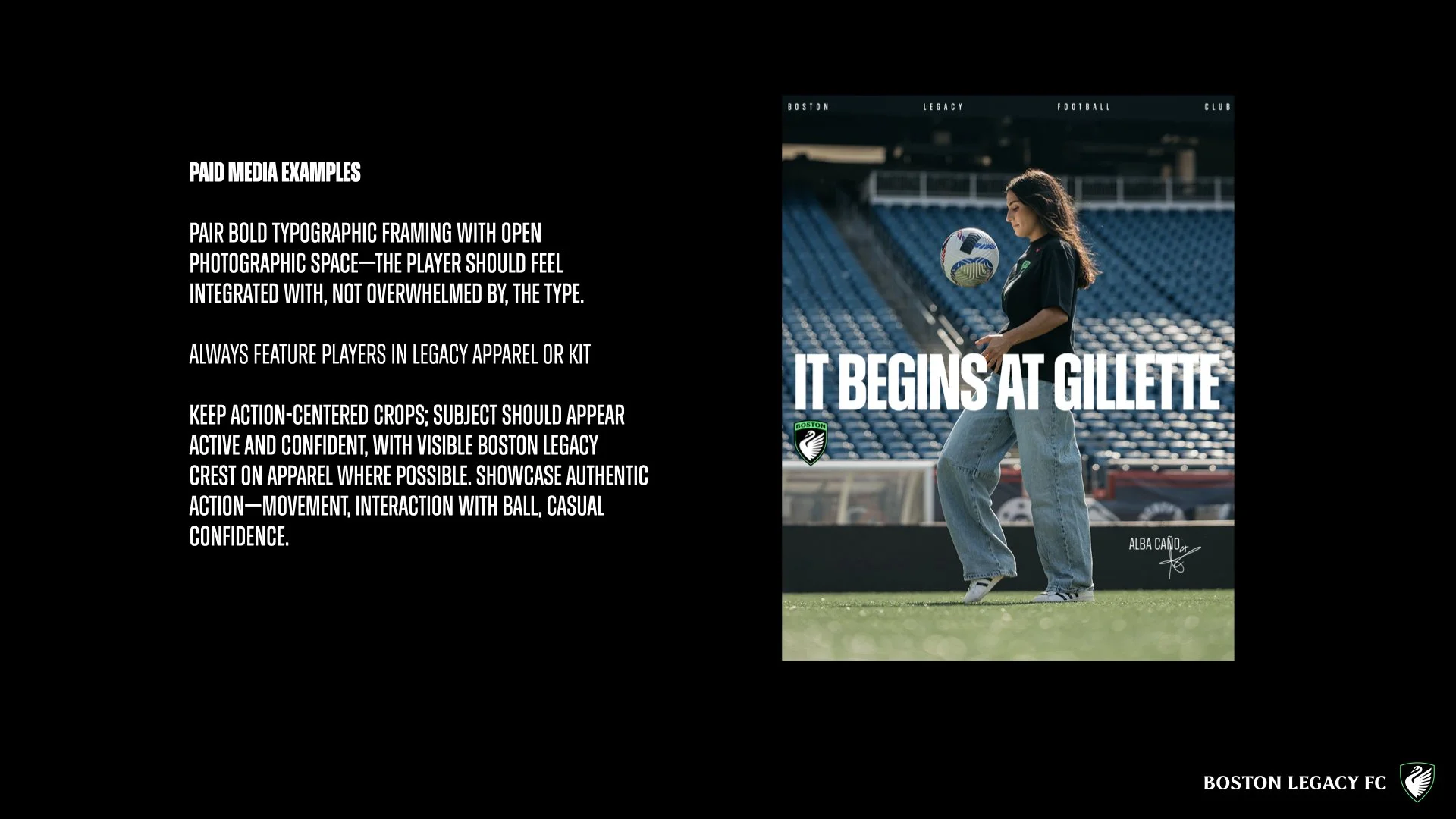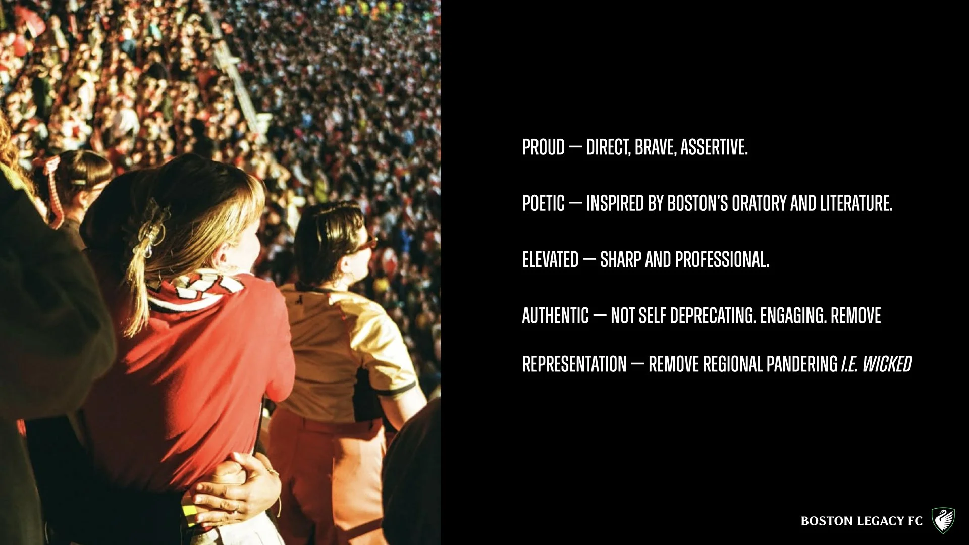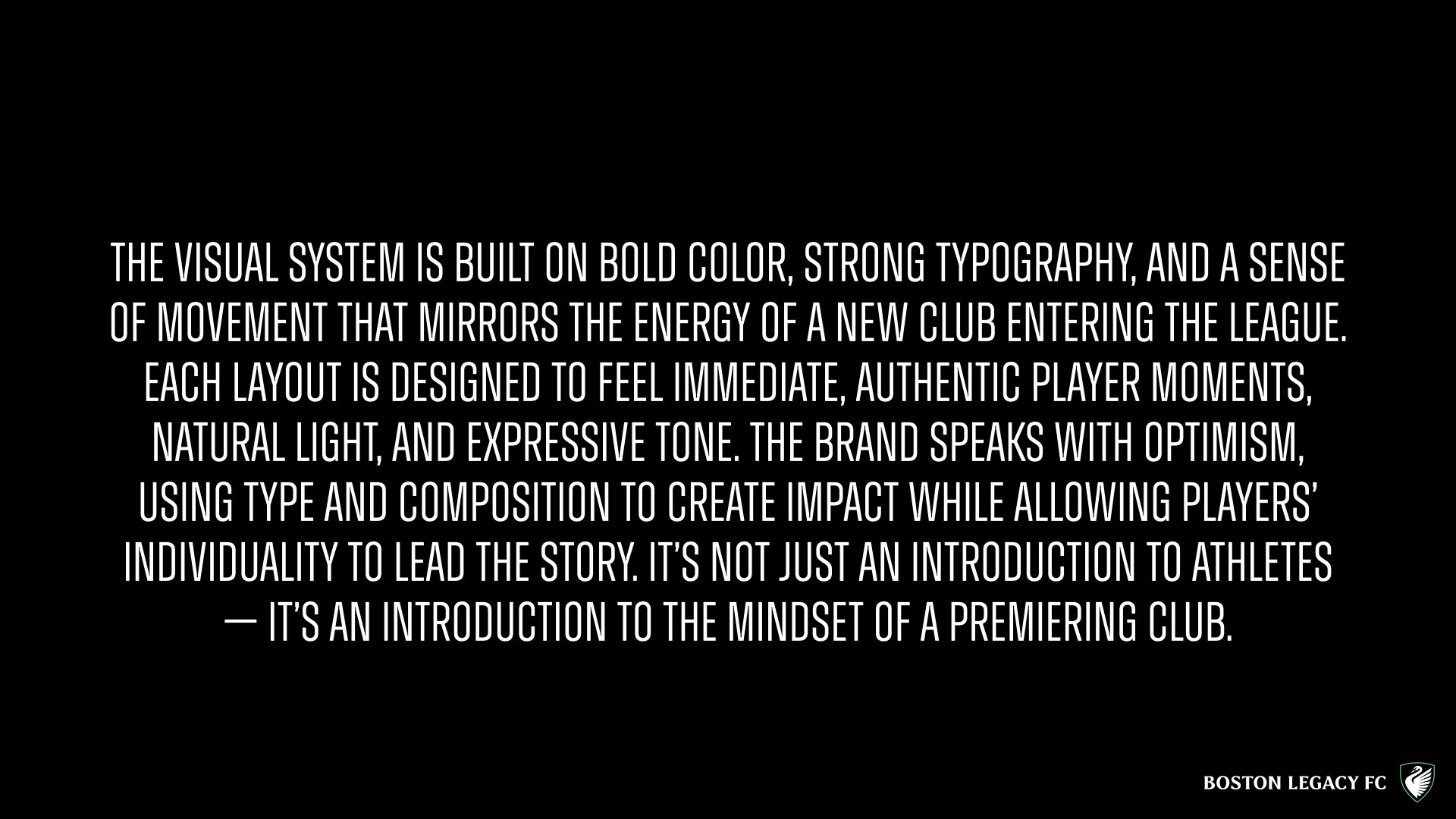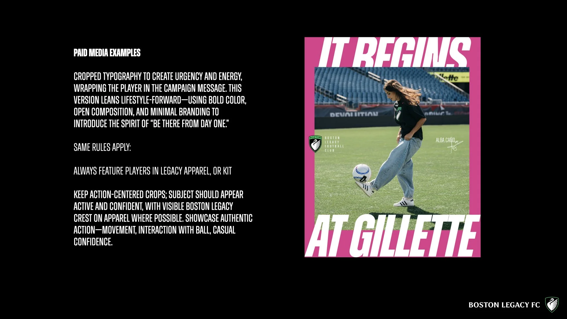 When I arrived at Boston Legacy as Senior Creative Director, I was tasked with rebuilding the brand identity. The club had gone through naming challenges and a marketing campaign that missed the mark, so it was clear the brand needed a reset.